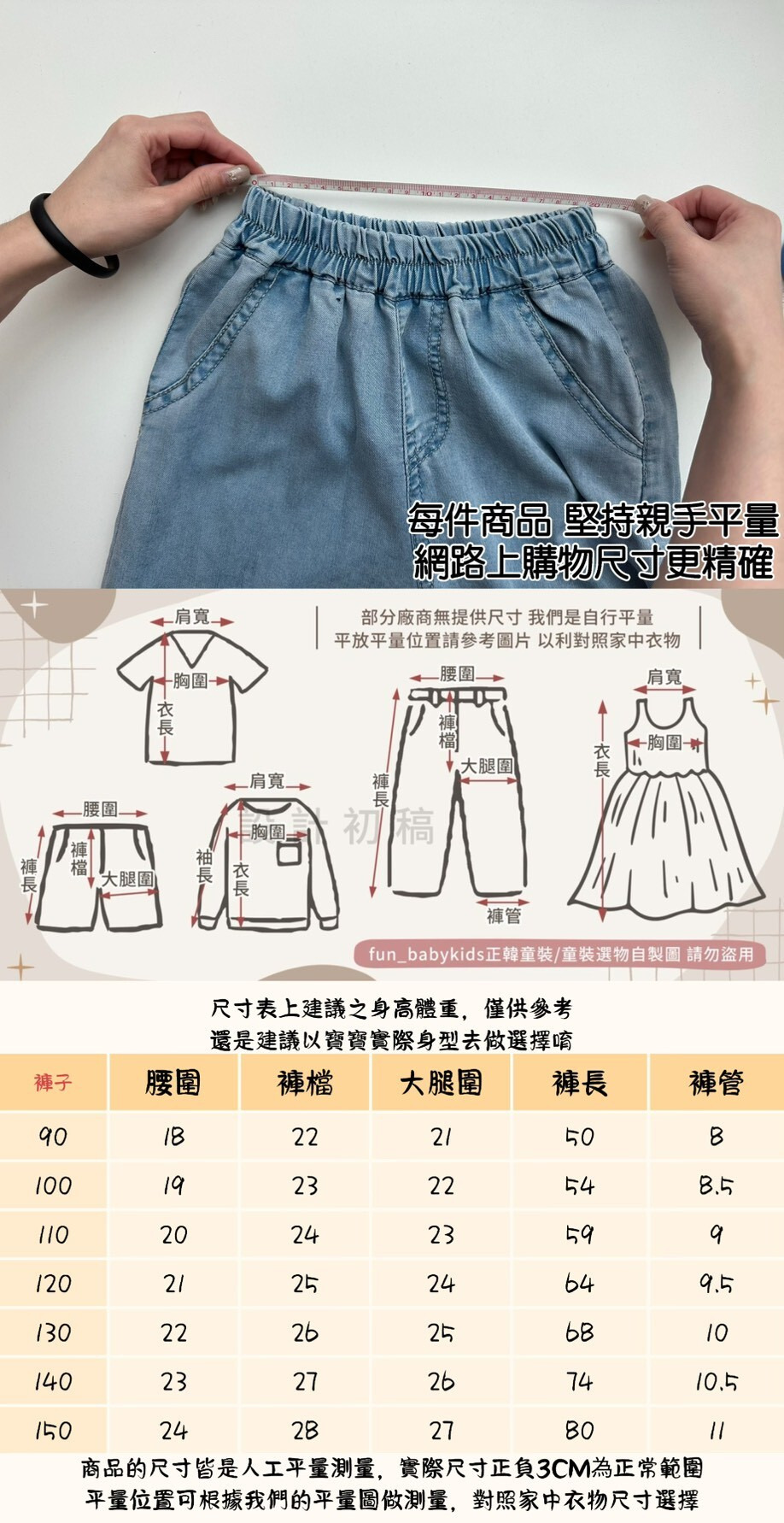 1.此件褲子為鬆緊腰帶,如果肚子較大或者肚子較肉的小朋友,要斟酌考量一下,也可以私訊我們提供您 鬆緊帶平量尺寸 供您參考